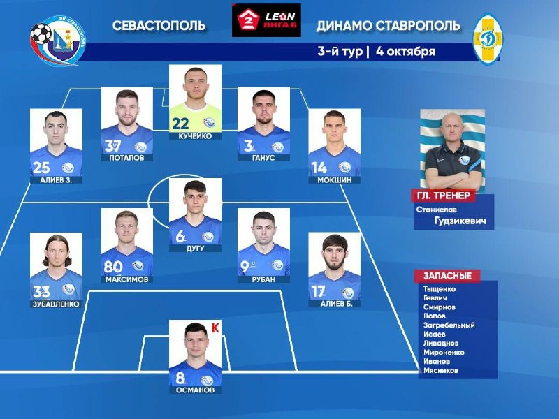 📢 Известен состав команды на предстоящей игре «Севастополя» с футбольным клубом «Динамо Ставрополь»