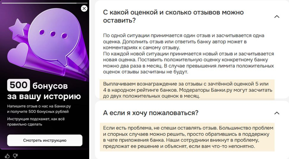 Банк начал рассылать своим клиентам индивидуальное предложение. Проверяйте у себя в колокольчиках и сторис. Суть акции – оставь хороший отзыв на банки.ру и получи 500 баллов кешбэка. Как попасть в акцию: вы должны быть клиентом банка, иметь дебетовую карту, получить приглашение на участие и иметь как минимум одну покупку по карте от 500 рублей в период акции. Отзыв должен быть о том, как вам помогли, быть достаточно подробным + банки.ру всегда любят документы/скриншоты. Принимаются к оплате только отзывы с оценкой 4 и 5)) Страница акции Условия акции Если вы еще не являетесь клиентом банка, то это можно сделать с бонусом в виде 2000 рублей сертификатом на Ozon, Золотое Яблоко, Wildberries, Магнит или Giftery Card