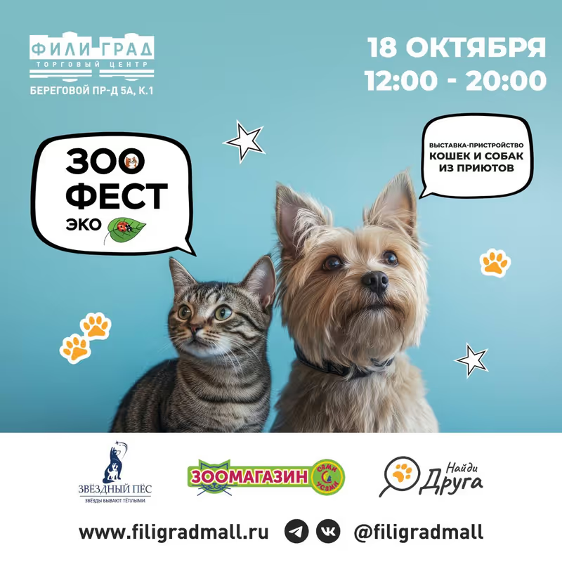 В Москве 18 октября состоится выставка-пристройство кошек и собак из приютов «Зоофест Эко». Это будет праздник любви к домашним животным и бережного отношения к природе. - Гостей ждет теплая встреча с очаровательными котиками, собачками, щенками и котятами. Уверены, они покорят ваше сердце, а может и наполнят чью-то жизнь новым смыслом. Берите с собой паспорт на тот случай, если решите забрать домой особенно понравившегося хвостика. А ещё будет большая праздничная программа с 14.00 до 17.00 - викторины, подарки и яркая детская анимация. С 13:00 до 18:00 - бесплатный тематический аквагрим. Фестиваль пройдет в ТЦ «Фили Град». Мероприятие проводится совместно с региональной общественной организацией содействия защите животного мира (РОО) «Найди друга». Вход бесплатный. - На одной площадке фестиваля мы соберем практически всех представителей домашних животных и множество прекрасных растений. 18 октября с 12.00 до 20.00. Москва, ТЦ «Фили Град», Береговой пр., 5А, к. 1.
