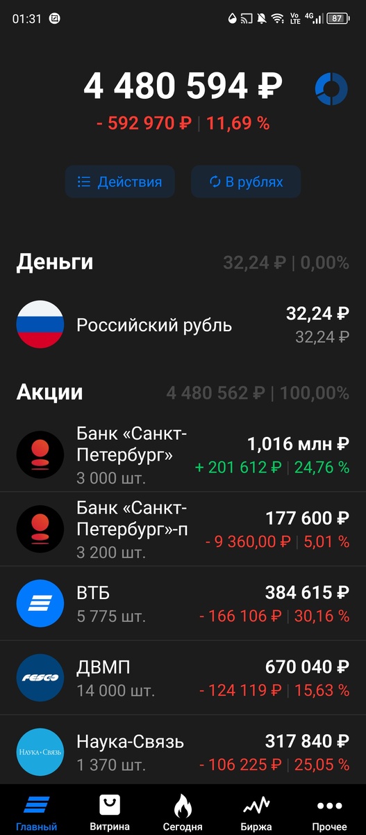 Рассказываю о своем инвестиционном портфеле российских акций (и теперь облигаций), его прошлом, настоящем и будущем, а также показываю картинки с котиками, куда же без них :) Продолжение. Предыдущая часть тут. И прежде чем продолжить Предупреждение! Всё что написано выше и ниже не является инвестиционной рекомендацией. Как-то так. Подошла к завершению 203я публичная неделя моего инвестиционного портфеля российских акций (только акции, только хардкор). Портфель за неделю подрастерял еще 223 тыщи, как и индекс Мосбиржи, закрывшийся в пятницу вечером на отметке 2604,55. Если бы его обсчитывали и в выходные он легко и ниже 2600 ушел бы, в понедельник узнаем точней :) По текущим делам в портфеле. В воскресенье, уже после прошлой статьи увидела цену префов банка Санкт-Петербург (БСПБ), она мне более-менее понравилась поэтому продав весь LQDT снова вернулась в префы БСПБ, на этот раз взяв уже 32 лота. На сдачу докупила 21 акцию ВТБ. В пятницу пришли дивиденды от Хэдхантера, 24,5 тыс. Подум