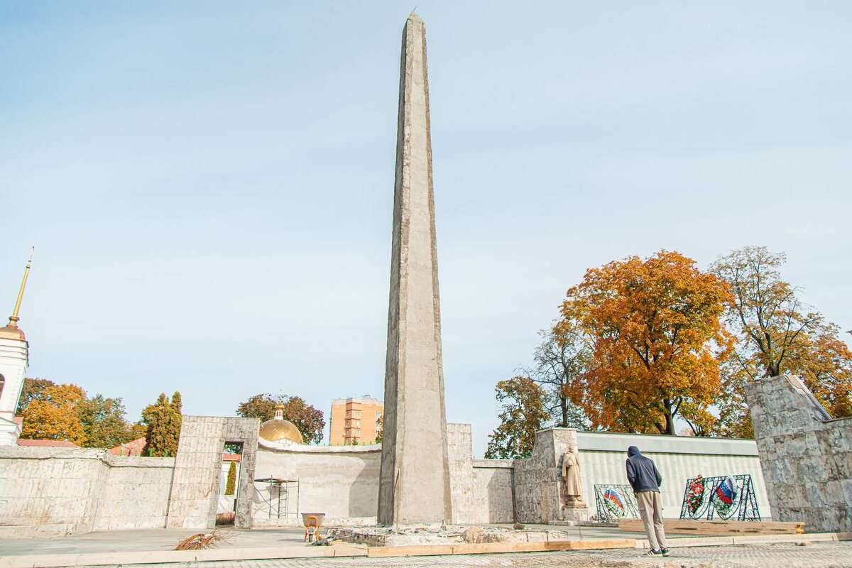 Тем временем на площади Революции уже восстановили бетонный постамент и портретно-геральдический барельеф, обновили тротуарную плитку вокруг памятника. Сейчас специалисты облицовывают постамент гранитом.