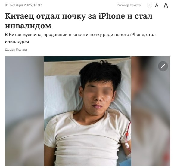 Жесть-история: китаец слил почку ради айфона и айпада — и остался инвалидом. В 2010 году 17-летний Ван Шанкур начитался статей, что «с одной почкой норм живут», и решил срубить бабла на чёрном рынке. А тут как раз вышли iPhone 4 и первый iPad — мечта подростка. Орган продал за 20 тысяч юаней (примерно $3135 по курсу 2011-го). Купил гаджеты, порадовался, но недолго — начались жёсткие инфекции, а оставшаяся почка быстро посыпалась. Сейчас Вану 31: работает всего 75% почки, плюс постоянная температура, слабость и кровь при мочеиспускании. Айфон устарел через пару лет, а вот здоровье — навсегда.... Подробнее: https://hard-tm.su/threads/119402/ 🕹HARD-TM — Подписаться