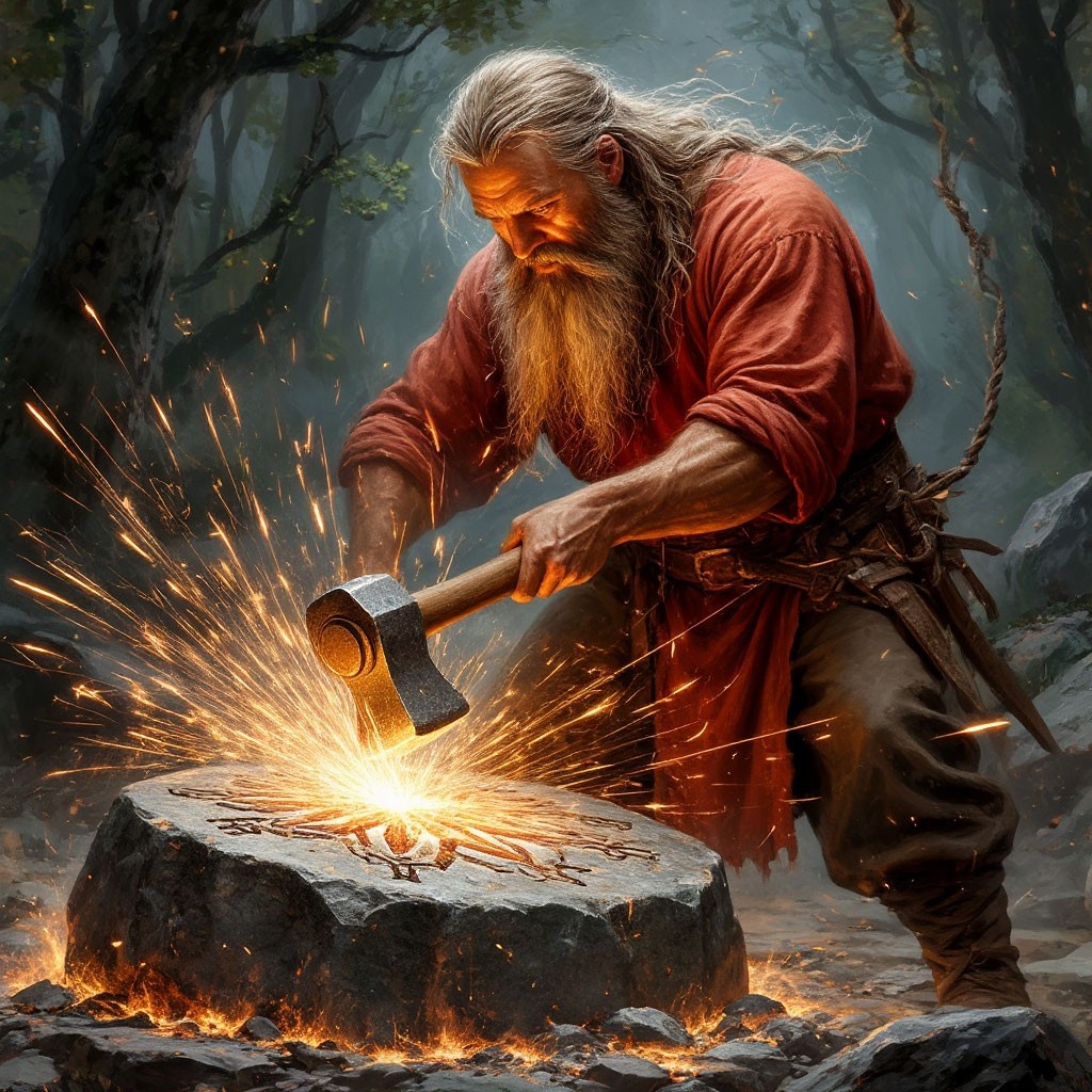 Из его искры возник Сварог — сын огня и света, творец миров. Голос Рода сказал: «Сотворяй мир, наполни пустоту жизнью и порядком». Сварог ступил на землю и ударил своим чудесным молотом по камню Алатырю — сердцу мира. От искр родились первые боги — Сварожичи. Так началось сотворение Вселенной. Сварог не был богом разрушения. Он — созидатель и мудрый учитель.