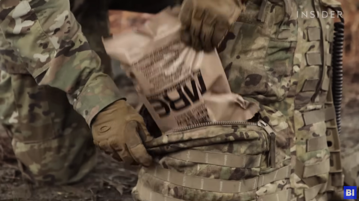 В переднем нижнем кармане трёхсуточного рюкзака сухие пайки MRE на соответствующий промежуток времени действий. Напомню, что американские пайки включают беспламенную химическую грелку, поэтому не требуют сухого горючего и прочего. Всё готовится быстро, если надо, то не выходя из машины.