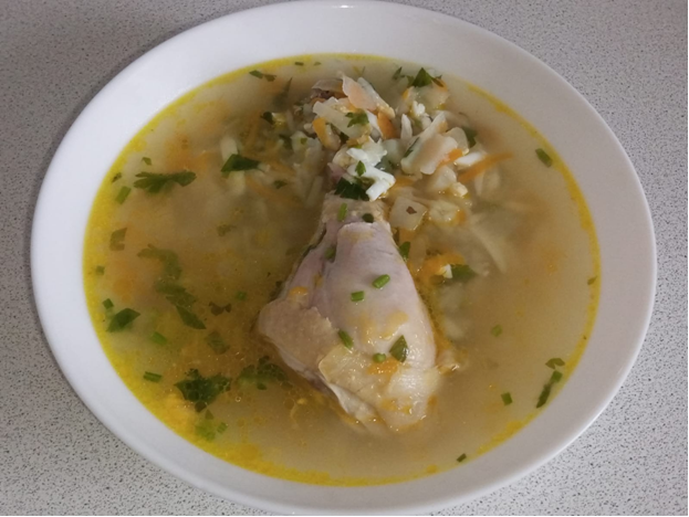 Вкусный сытный супчик, который нравится всей семье. Ингредиенты: - две куриные грудки или ¼ курицы; - вода – 3 литра; - картофель – 3-4 средние шт.; - лук репчатый – 1 головка; - яйца – 3 отварные шт.; - морковь – 1 шт.; - макароны – 2,5-3 ст. ложки; - соль – по вкусу; - перец черный молотый – по вкусу; - растительное масло для обжаривания лука, моркови; - петрушка – по вкусу. Подготовила ингредиенты. В кастрюлю налила воду, поставила на плиту. Совсем мне не нравится накипь, а особенно при варке курицы, поэтому нарезанную курицу добавляю в закипевшую воду, провариваю 10 минут, добавляю нарезанный картофель. Варю до готовности картофеля, добавляю макароны, соль, перец черный молотый. Мелко нарезанный лук обжариваю на растительном масле с натертой на терке морковкой. Отварные яйца натираю на терке, петрушку измельчаю ножом. За две минуты до готовности макарон указанной на упаковке добавляю обжаренный лук с морковью, перемешивая. Добавляю яйца, зелень, провариваю 1-2 минуты, отключаю нагр