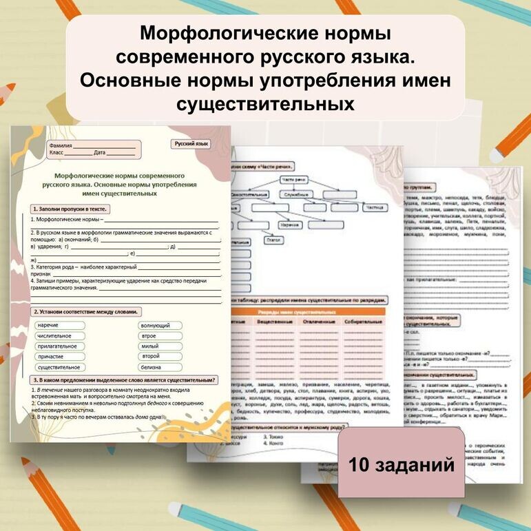 Рабочий лист «Морфологические нормы современного русского языка. Основные нормы употребления имен существительных» разработан для проведения урока русского языка в 10 классе. Эта разработка поможет ученикам повторить изученный материал по данной теме. Рабочий лист можно использовать и для проверки знаний учащихся. Методический материал состоит из десяти заданий и ответов к ним. Содержание упражнений: Рабочий лист «Морфологические нормы современного русского языка. Основные нормы употребления имен существительных» представлен в двух форматах: pdf и pptx, подходит для черно-белой печати. Похожие материалы вы можете посмотреть, перейдя по следующим ссылкам: https://infourok.ru/magazin-materialov/rabochij-list-morfologiya-kak-razdel-lingvistiki-povtorenie-obobshenie-1111590 https://infourok.ru/magazin-materialov/rabochij-list-fonetika-i-orfoepiya-kak-razdely-lingvistiki-izobrazitelno-vyrazitelnye-sredstva-fonetiki-povtorenie-obobshenie-951401 https://infourok.ru/magazin-materialov/rabochij