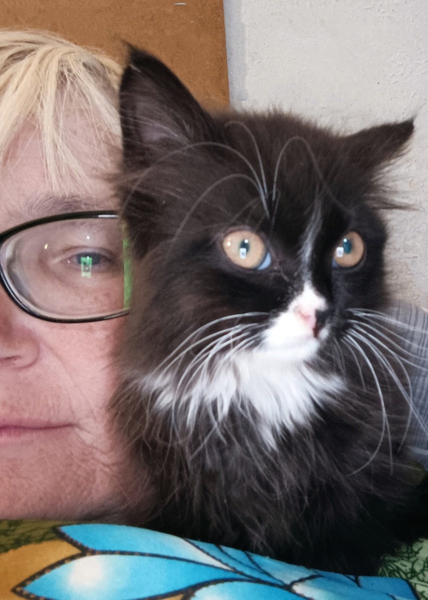 За мной ходит следом, куда я, туда и она. Спит со мной тоже. Живёт у меня уже неделю. На кошек уже не шипит и не рычит, на неё теперь шипит Молли. Кстати, помню что обещала сфотографировать Молли, завтра обязательно сфоткаю.