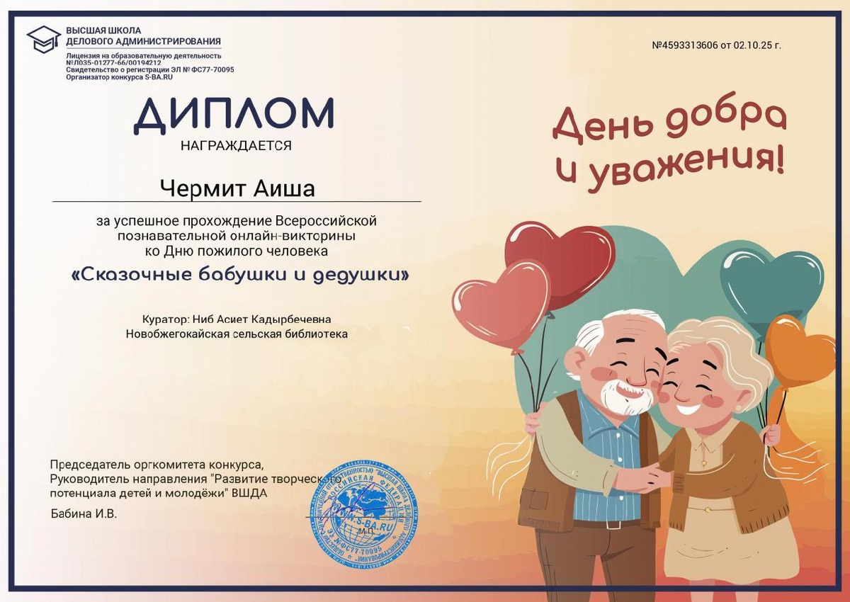 🌟 Юные читатели Новобжегокайской сельской библиотеки! 🌟 Мы рады поздравить наших талантливых участников – Чермит Аишу, Нагой Фатиму и Нагой Асию – с успешным выступлением во Всероссийской познавательной онлайн-викторине ко Дню пожилого человека «Сказочные бабушки и дедушки»! 🎉 Ваши знания и увлечение литературой не остались незамеченными, и мы с гордостью сообщаем, что наши юные читатели были награждены дипломами! 📜👏 Благодарим вас за активное участие и желаем новых творческих успехов! Читайте, развивайтесь и открывайте для себя удивительный мир книг! 📚💖 #новобжегокайскаябиблиотека #деньпожилогочеловека #викторина #гордостьбиблиотеки