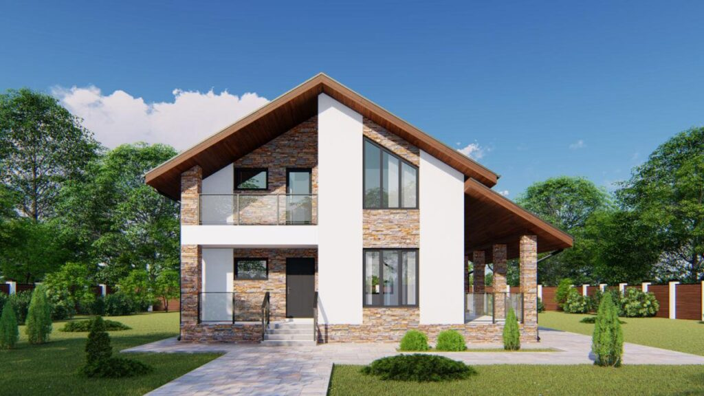 Современный двухэтажный дом с лаконичной архитектурой и выразительным фасадом. Основной акцент сделан на сочетании светлой штукатурки и облицовки под натуральный камень — такое решение выглядит солидно и не выходит из моды. Кровля выполнена в виде асимметричной двускатной конструкции с широкими свесами, что не только добавляет объёма, но и надёжно защищает стены от осадков.