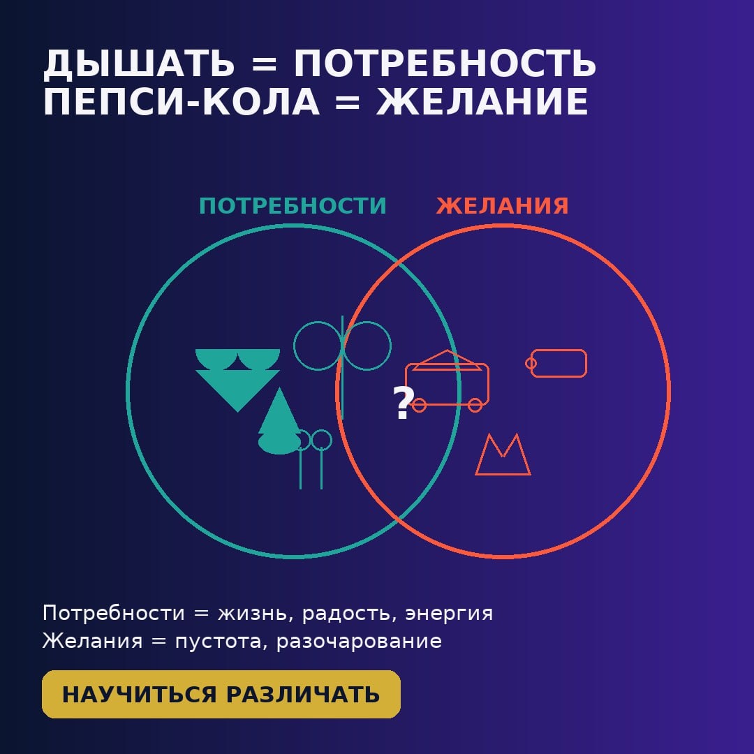 ⚖️ Дышать — это потребность. Пепси-Кола — желание. А что из этого управляет ТВОЕЙ жизнью? Мы гонимся за желаниями, принимая их за потребности: • Покупаем новое, хоть старое работает • Ищем одобрение, жертвуя своими границами • Заедаем эмоции, вместо того чтобы их прожить А потом удивляемся: почему получил «хотелку», а счастья нет? 💔 Стоп! Пора научиться отличать одно от другого. Уже 9 октября 2025 года мы проведем второй урок нашего курса «Активация Жизни» с точным ответом: «Как выявить свои истинные потребности и желания?» На этом уроке ты получишь не просто теорию, а работающие инструменты: 🔍 Метод «Эмоциональный компас» — как по чувствам выйти на свою настоящую потребность 📌 Техника «Линия запроса» — чтобы отделить «хочу» общества от твоего «надо» 💥 Формула «Декодирование желаний» — что стоит за твоим «хочу новую машину/отношения/работу» ✨ Практика «Экологичное насыщение» — как закрывать потребности, чтобы не подсаживаться на суррогаты Результат после урока: • Принимаешь