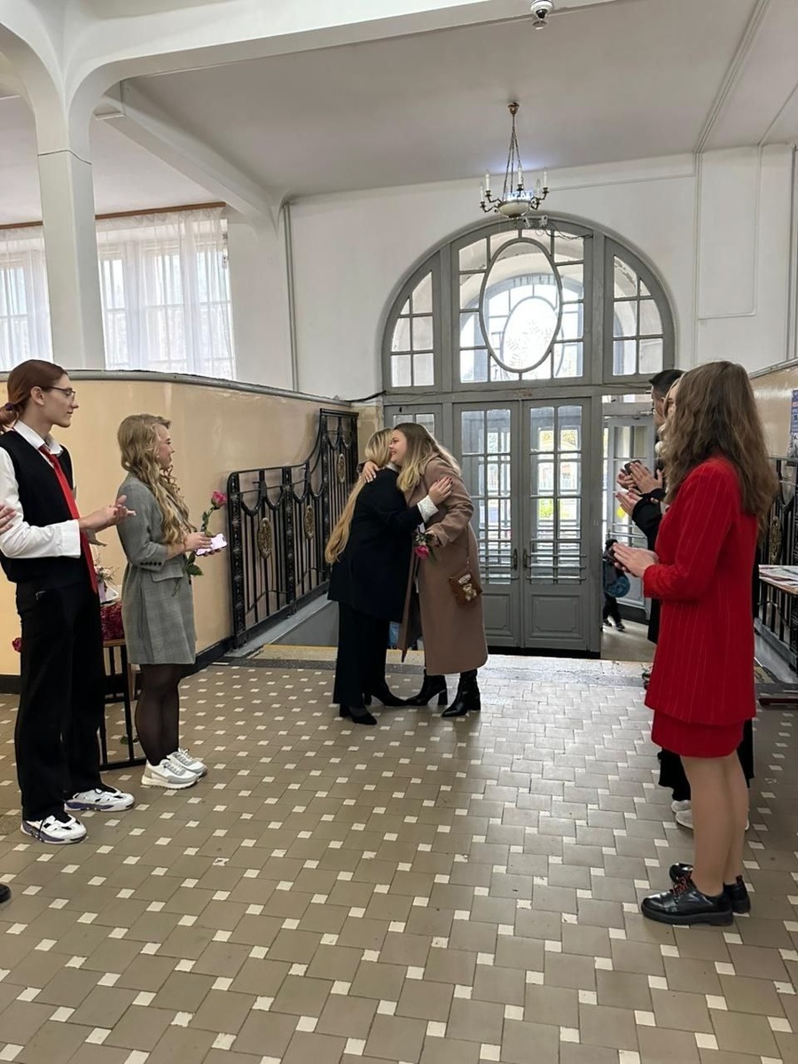 В школе с самого утра царила праздничная атмосфера: звучали песни, на входе любимых педагогов встречали 11-классники с цветами и поздравлениями.