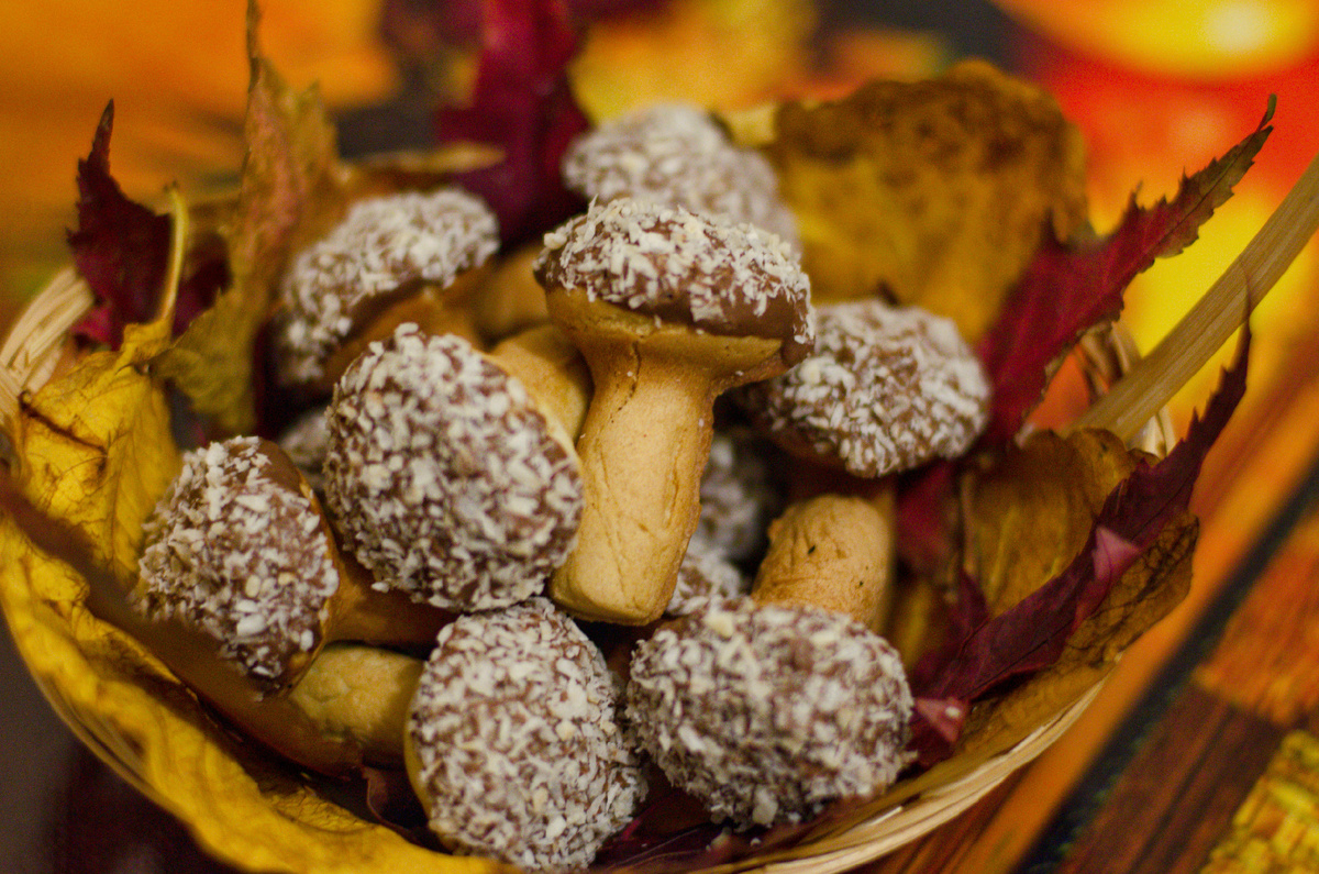Если вы, также, как и я, не ходили в лес за грибами, стоит приготовить грибы на собственной кухне. Печенье по этому рецепту можно готовить не только в виде грибов (если у вас есть советские формы для выпечки - белочки, орешки, грибочки), но и выпекать в духовке в виде обычного печенья, вырезая формочками, или делать шарики, немного прижимать их и отпекать. Главное, чтобы печенье не подгорело. Украшать такое печенье можно по своему вкусу. У меня был темный шоколад и кокосовая стружка.