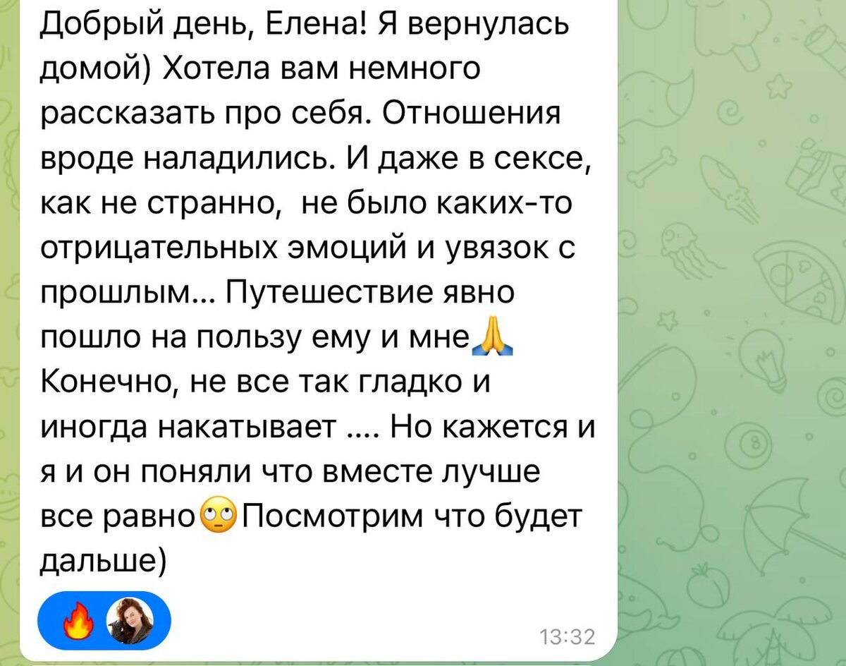 Уже после первой встречи становится легче, а к четвёртой ты чувствуешь устойчивый результат: внутри спокойно, а решения ты принимаешь из потому что уверенна, а не потому что тебе страшно или обидно.