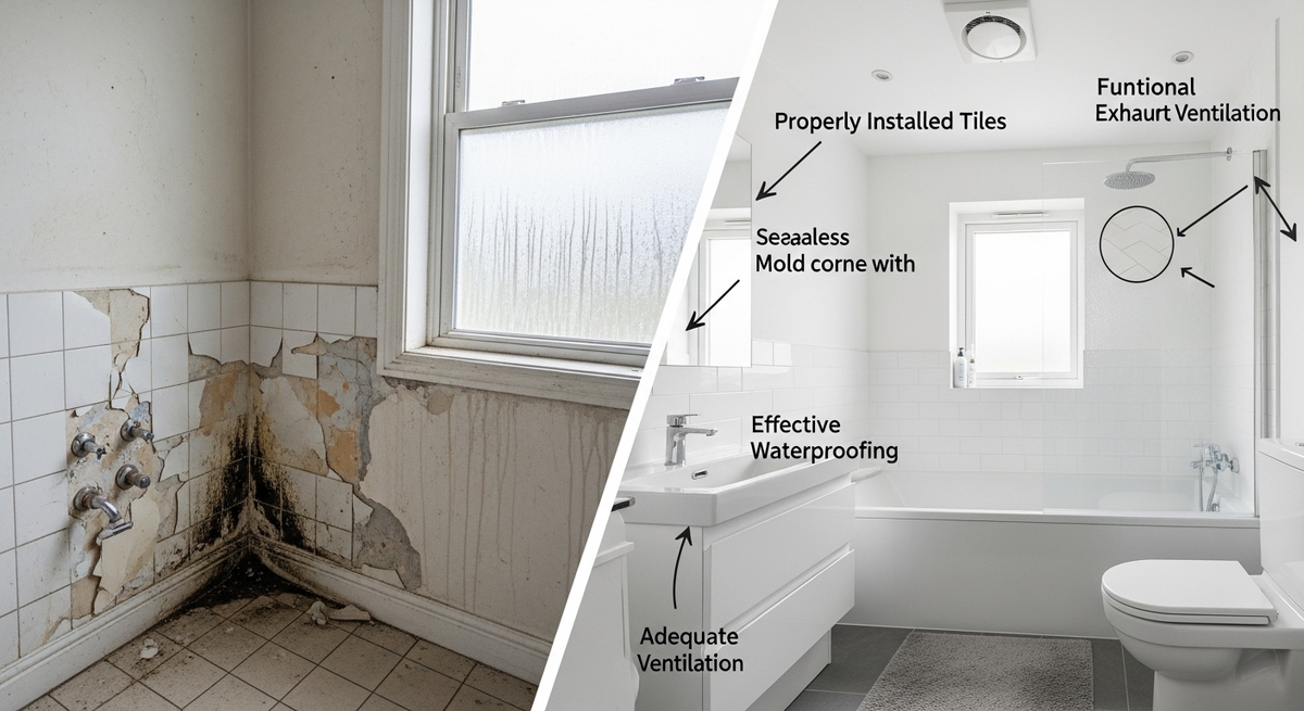 Два года назад Дмитрий сделал ванную комнату мечты - 480,000₽ на материалы, 120,000₽ работа. Итальянская плитка, немецкая сантехника, все по высшему разряду. Через 8 месяцев позвонил в панике: "Плитка отваливается, в углах плесень, постоянно сыро. Прорабы говорят - переделывать!"