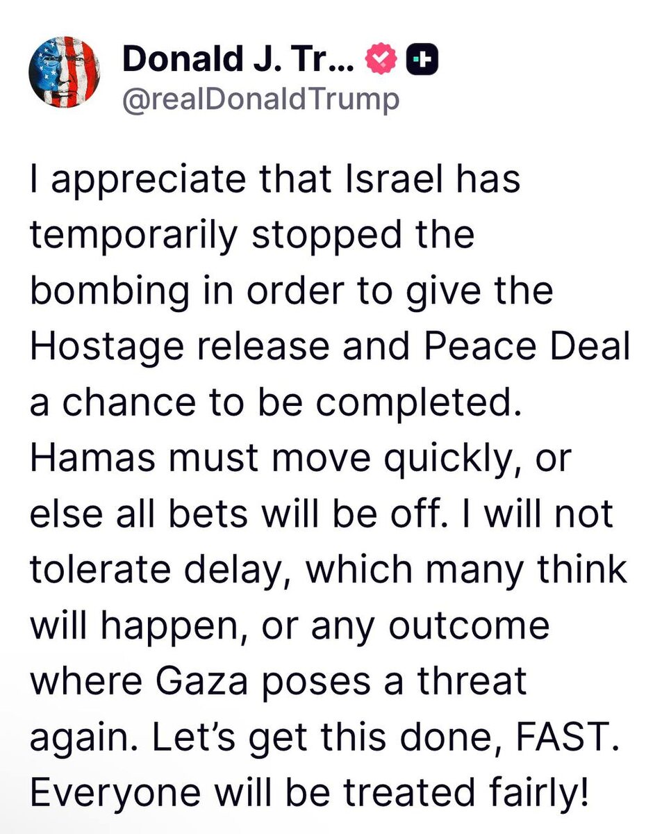 Трамп благодарит Израиль за остановку боевых действий и ожидает, что ХАМАС освободит заложников, иначе сделка может быть отменена