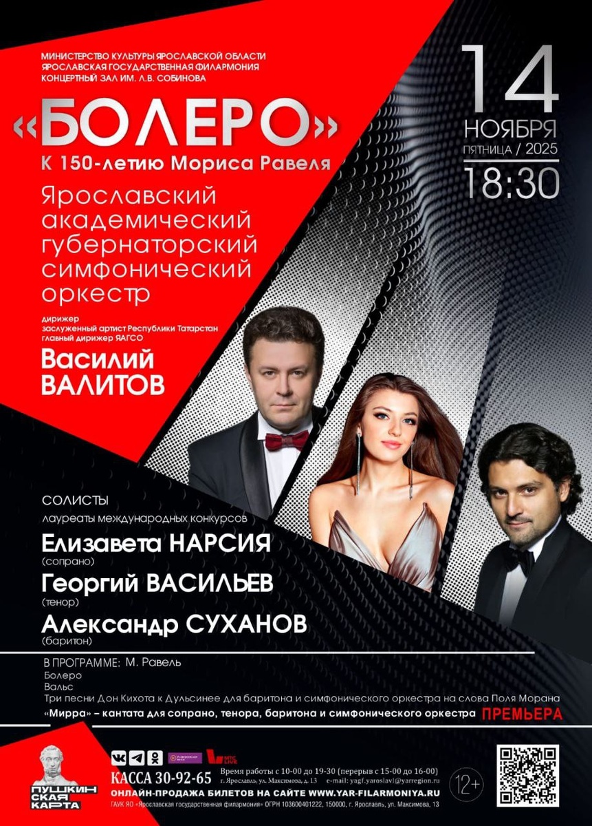 ⚠️Уважаемые слушатели, приглашаем Вас на уникальный концерт-событие. 14 ноября (пятница) 18:30 в Концертном зале им.Л.В.Собинова. В этот день ✨️впервые прозвучит Кантата Мирра" Мориса Равеля для сопрано, тенора и баритона в исполнении 🌟 Ярославского академического губернаторского симфонического оркестра под управлением маэстро Василия Валитова. В программе вечера будут исполнены ✨️знаменитые произведения композитора. Ждем вас, дорогие наши слушатели. Заказ билетов на сайте: https://quicktickets.ru/yaroslavl-filarmoniya/s98 #ЯАГСО #культурадляшкольниковяо@yagso1944