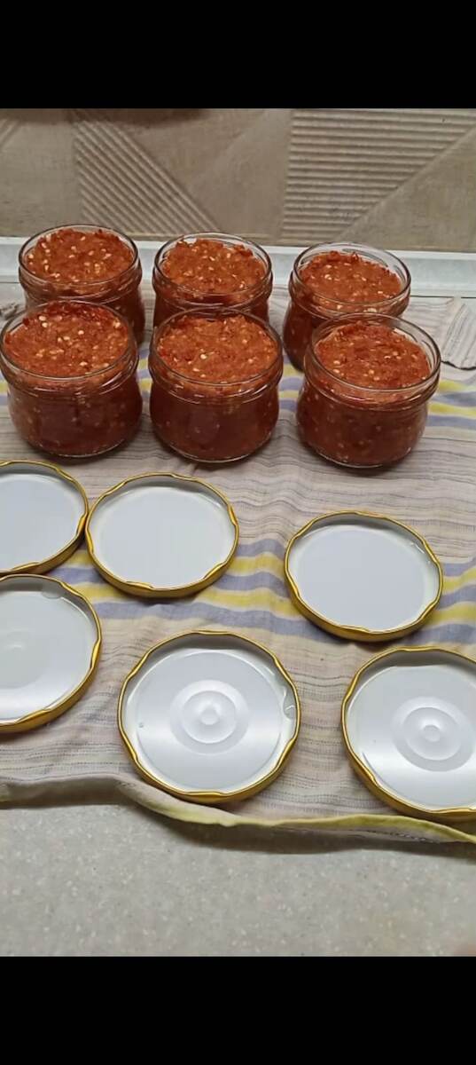 Ингредиенты: Острый перец 700 г Болгарский перец 300 г Чеснок 2 головки Соль 1 ст л с большой горкой Растительное масло по 1 ст л на банку Перцы промыла, удалила плодоножку; чеснок очистила. Все овощи перекрутила через мясорубку, добавила соль и хорошо перемешала все аджика готова. Т.к. я из перцев не удаляла семена, они все сохранились в целом виде. В следующий раз я буду семена удалять из перца. Готовую аджику перекладываю в банки по 250 мл и сверху наливаю 1 столовую ложку растительного масла. Масло препятствует попаданию кислорода, тем самым продлевая срок хранения. Банки закрываю крышками и хранить буду в холодильнике. Из этого количества перцев у меня получилось 6 баночек.