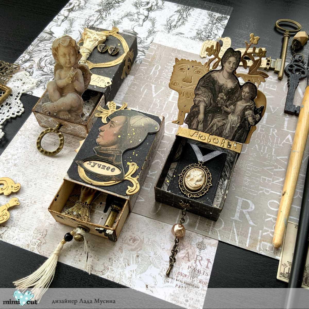 Привет-привет! С вами снова Лада Мусина. На этот раз я приготовила для вас 3 крошечных артефакта в спичечных коробках - матчбоксы с отсылками к искусству средних веков и эпохи Возрождения. Произведения искусства тех времен — это не просто отражение эпохи, но и свидетельство вечного стремления человека к красоте и духовности. Вдохновением к матчбоксам послужил набор ножей «Страдающее средневековье». Как же мне хотелось придумать красивую историю для страдающего льва! И она, конечно, про любовь! Винтажного наполнения коробков мне показалось мало. Захотелось добавить небольшой интриги. Фишкой коробочек стала интерактивная составляющая. Хочется снова и снова открывать-закрывать мини-шкатулки и крутить «колесо времени»! В создании матчбоксов кроме набора «В спичечном коробке» приняли участие «Слова для души», «Бабушкин альбом», «Выгляни в окошко», «Что скрывает шкаф», «Дай мне руку», «Nota bene». Всем любви и добра! И только приятных страданий!