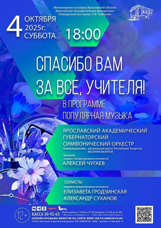 Сегодня прошел концерт Ярославского академического губернаторского симфонического оркестра под управлением Василия Валитова "Спасибо вам за все, учителя". В концерте принимали участие солисты Ярославской государственной филармонии лауреаты международных конкурсов Елизавета Гродзинская и Александр Суханов. Ведущий концерта Константин Корниенко. Вечер получился теплым и атмосферным, искренним и нежным . Концерт - благодарность каждому учителю и педагогу за их непростой труд и горящее сердце. #ЯАГСО В этом посте есть большое видео, которое не загрузилось в Дзен. Откройте оригинал поста в телеграме, чтобы его посмотреть