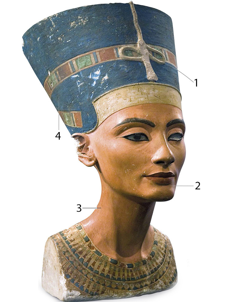 Панегирик Эхнатона, надпись около 1350 г. до н.э. "Великая царственная жена" Эхнатона, фараона XVIII династии Египта, Нефертити появляется в сценах на стенах нескольких фиванских гробниц. Этот бюст, найденный в мастерской придворного скульптора Тутмоса, придаёт ей поразительно современный вид. Красота Нефертити может быть реалистичной, но она также символична: её правильность указывает на её положение в обществе. 1. Урей (стилизованная кобра) над лбом Нефертити – символ королевской власти и мудрости. От головы кобры остался лишь обрубок. 2. Нефертити выглядит величественно, без украшений, и на ней нет никаких надписей. Власть царицы говорит сама за себя. 3. Для придания коже царицы насыщенного и тёплого оттенка был использован пигмент оксида железа. 4. Корона с плоским верхом напоминает корону Тефнут, богини живительной влаги. Она возвышается, поднимаясь, и вместе с уреем подчёркивает симметрию её лица. Фрагм