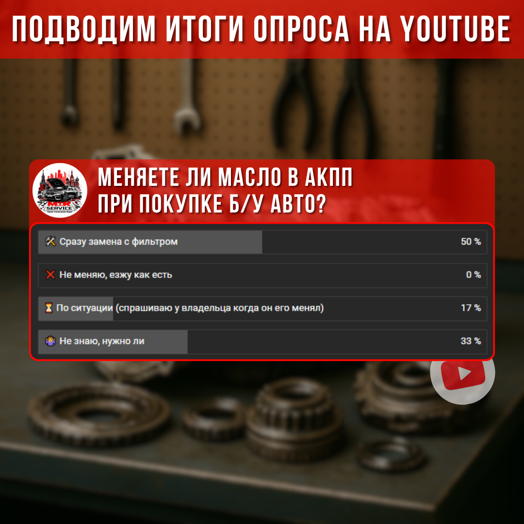 Мы подвели итоги опроса на YouTube. 50% водителей сразу меняют масло и фильтр после покупки, 17% уточняют у продавца, а 33% вообще не знают, нужно ли это делать.