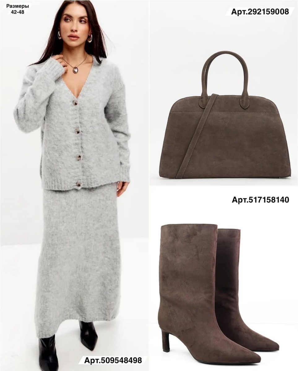 - Для встреч и прогулок. Серый комплект 509548498 с замшевыми сапогами 517158140 и сумкой 292159008. Добавьте шёлковую косынку в тон мокко — получится спокойный, но выразительный акцент у лица.