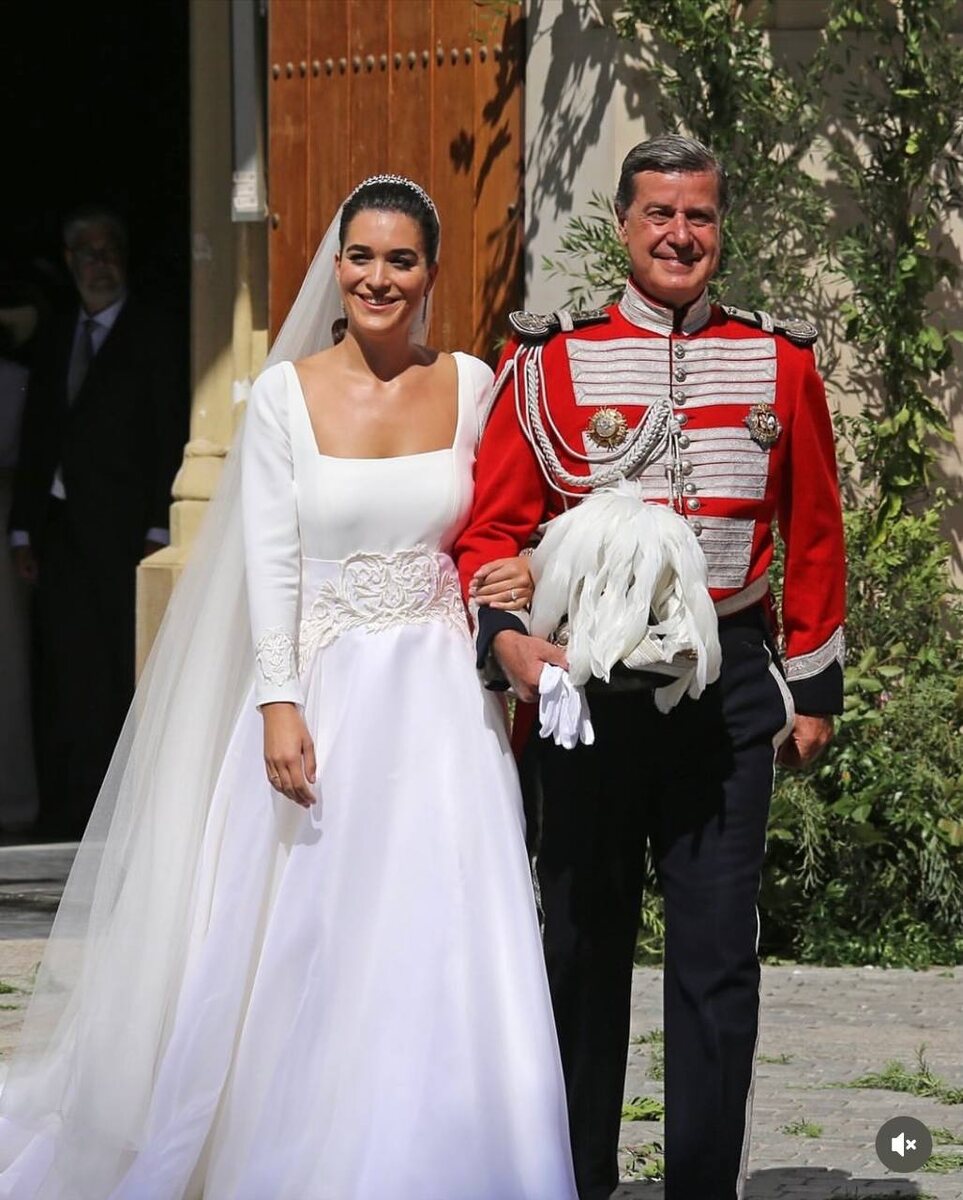 Рубрика «Свадьба дня». Сегодня в Севилье состоялась свадьба аристократа, сына покойной герцогини Альба, 62-летнего Каэтано Мартинеса де Ирухо и организатора мероприятий, 29-летней Барбары Мирьян (дочь предпринимателя ливанского происхождения Хавьера Мирьяна). Пара, к слову, встречается уже на протяжении десяти лет. Для жениха это уже второй брак (в первый раз Каэтано женился на Женевьеве Казанове в 2005 году. У них родились близнецы, Луис и Амина), но он не стал нарушать традиций и как и в первый раз появился на торжестве в парадном мундире Королевской кавалерийской школы Севильи, а роль посаженной матери исполнила его дочь - Амина. Невеста предпочла для торжества свадебное платье от модного дома Navascués. Свадьба Каэтано Мартинеса де Ирухо и Барбары Мирьян собрала видных персон испанского высшего общества. Хотя пара надеялась на скромное торжество, церемония вызвала большие ожидания. Более 300 гостей, включая родственников, друзей и деятелей светской и культурной жизни, сопровождали