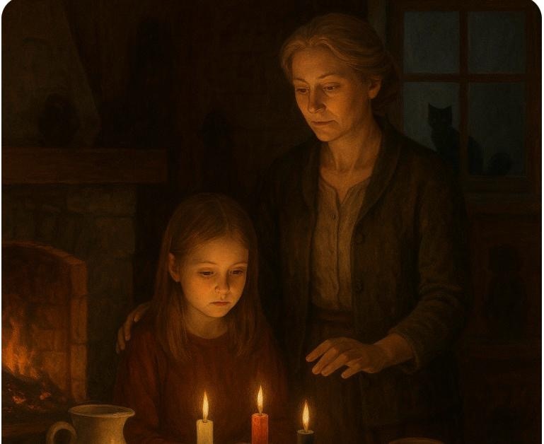 Когда Наталью отправили домой, Светлана повела Аню в гостиную. Девочка дрожала, но слушалась. Дом словно поддерживал их — огонь в камине горел ровно, без треска, а в углу тихо сопел Мракобус, будто сторожил. Светлана поставила на стол три восковые свечи. — Смотри, Анюта, — сказала она мягко. — Эти свечи — как три стража. Они горят, чтобы тебя видеть и беречь. Ты ничего не бойся. Она зажгла первую свечу, и пламя мягко качнулось. — Это свет для тебя, девочка. Пусть защищает твой сон и твой путь. Зажгла вторую. — Это свет для дома. Чтобы сюда не входил тот, кто не зван и не нужен. И третью. — А это свет для той, что тебя тревожит. Чтобы ей найти дорогу туда, где ей давно положено быть. Перед свечами Светлана поставила блюдце с кусочком хлеба и глиняную чашку молока. — Усопшим всегда оставляют угощение, чтобы они не держались за живых. Покойнице нужно уйти с миром, а не тянуть тебя за собой. Аня смотрела широко раскрытыми глазами, но уже не дрожала. Светлана взяла девочку за руку и произн
