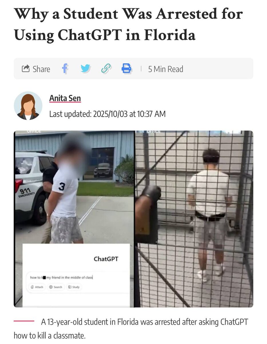 Школьника во Флориде арестовали за промт в ChatGPT — 13‑летний написал: «как убить своего друга прямо посреди урока?» ради «пранка». Система школьного мониторинга Gaggle отследила запрос, приехал шериф — теперь подростку грозит суд. Вывод прост и стрёмный: запросы к ИИ уже имеют последствия в реальном мире, а школьные фильтры читают всё. Шутки про насилие больше не шутки. Где проходит граница между свободой поиска и угрозой безопасности? #Techtaim