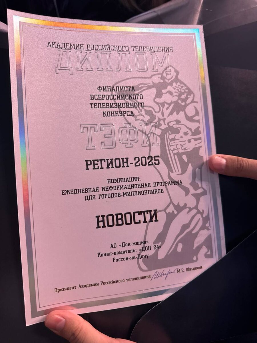 ⚡️«Новости» телеканала «ДОН 24» вышли в финал «ТЭФИ-Регион» 📺Передача признана одной из лучших в номинации «Ежедневная информационная программа для городов-миллионников». В финале также оказались челябинские «Вести» и красноярские «Новости». 🏆В Светлогорске в «Янтарь холле» в эти минуты продолжается церемония награждения финалистов 24-го Всероссийского телевизионного конкурса «ТЭФИ-Регион»-2025. Ее ведут член Академии Российского телевидения Арина Шарапова и актер театра и кино, диктор Константин Анисимов.