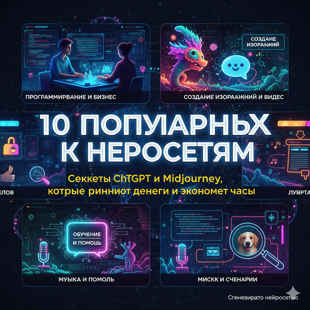 Нейросети — ваш личный помощник для заработка и творчества Нейросети больше не игрушка, а мощнейший инструмент, который уже изменил жизнь миллионов. Вы можете использовать их для заработка, обучения или творчества, но знаете ли вы, как правильно? Мы проанализировали 10 самых популярных и эффективных запросов, которые пользователи вводят в ChatGPT, Midjourney и другие сервисы. Готовьтесь удивляться и сохранять себе — здесь есть даже ваши любимые "промты"! 5 Золотых Запросов для Работы и Бизнеса (Экономия часов и денег) Самый большой сегмент пользователей использует ИИ для повышения продуктивности. Посмотрите, как они помогают зарабатывать: 1. «Напиши продающее письмо/пост/описание товара» Это хит! Нейросеть выступает в роли копирайтера и SMM-специалиста, экономя время на создании контента. Пример промта: «Действуй как опытный копирайтер. Напиши 5 вариантов цепляющих заголовков для поста о новом фитнес-курсе. Стиль — дружелюбный и мотивирующий.» 2. «Проанализируй текст на плагиат и ошиб