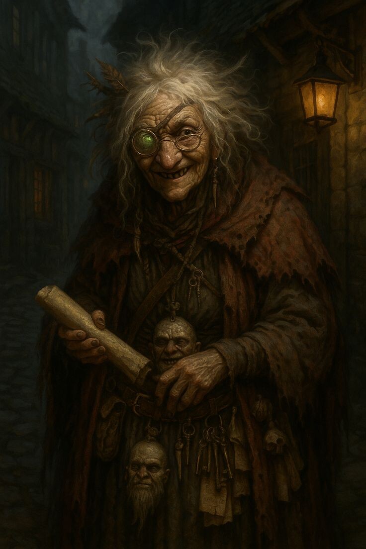 Она была невысокой и скрюченной, словно старое корявое дерево. Длинные, спутанные в колтуны волосы скрывали лицо, но из-под них виднелся крючковатый нос и острый с бородавками подбородок. Худые, костлявые руки с длинными грязными ногтями теребили какой-то клочок ткани. Она была одета в какие-то лохмотья, сливающиеся с темнотой.