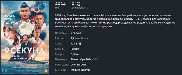 Жанр: драма. История дальневосточного 19-летнего старшего матроса Алдара Цыденжапова, героя России посмертно, в честь которого ходит на Дальнем Востоке одноимённый корвет. Я сам дальневосточник, но не знал эту историю о нашем герое - до просмотра этого фильма. Спасибо Фонду развития Забайкалья и МО РФ, что создали эту кинокартину. Фильм снят просто, без всяких там. Почти документалистика. Но от этого не стал менее интересным. Давно не видел такого простого, хорошего, нашего кино. Видно, что в съёмках были заняты на главных ролях начинающие актёры и не актёры. А на второстепенных - звёзды российского кино. От этого история преподносится ещё более естественно, без голливудского пафоса. Нет комбинированных съёмок и обилия графики. Натурные съёмки из Владивостока и с мест событий. Хорошее кино, доброе. Кому не хватает любви Родины - советую посмотреть. Да и для просвещения молодёжи вполне пригодно. Рекомендую. Подписаться на Пикабу Познавательный. и Пикабу: Истории из жизни.