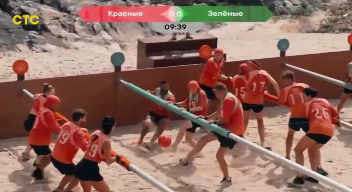 В прошлом выпуске остров покинули три игрока. Радио затрещало. Дмитрий сказал нужно разделиться на команды. И выбрать двух капитанов. выбрали 50 Артёма и 1 Романа. Испытание за ресурсы. Одна команда выиграет ресурсы, вторая команда будет голодать. Кикер. Настольный футбол огромного размера. Борются за шикарный накрытый русский стол: селёдка с картошкой, шпроты, сало, соленья, пюрешка с котлетками. 10 минут на испытание. Красные атаковали чаще. На 8-й минуте 1:0 в пользу красных. Через 50 секунд счет стал 1:1. на 6-й минуте 2:1 в пользу красных. 3:1. И осталось пять минут. Был перерыв и можно было поменяться местами. Красные остались на месте, у зеленых были изменения. В моменте игры, соперники отбивая мяч (стояли спинами к Сергею) ,42 Сергея случайно ударили по ноге. 3:2. Осталась одна минута до конца матча. Счет 3:2 в пользу красных. 42 Сергею понадобился врач. Команда выигравших наслаждалась обедом. А команда проигравших выясняла кто же виноват. Они были подавлены и ели