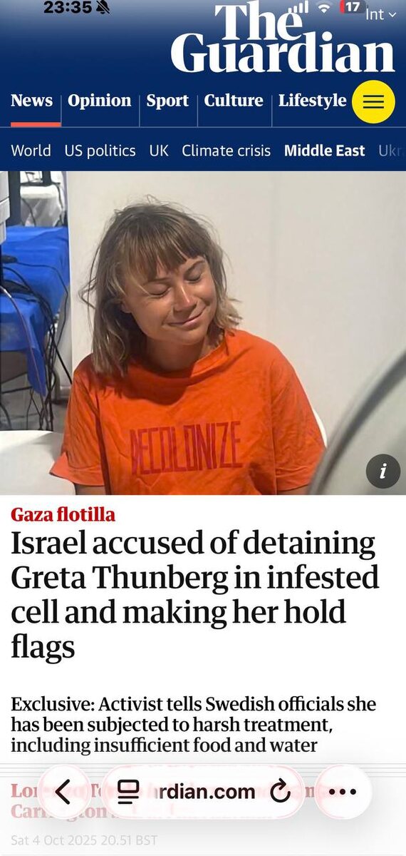Израиль обвиняют в заключении Греты Тунберг в камеру с клопами и принуждении её держать флаги. Грета Тунберг сообщила шведским властям, что в израильском заключении подвергается жестокому обращению. В переписке, которую видели журналисты, говорится, что один из заключённых рассказал об увиденном: израильские правоохранители заставляли Тунберг держать флаги и фотографировали её с ними. Правда, что за флаги "очевидец" сказать не смог. Кроме того Тунберг пожаловалась на обезвоживание, недостаток пищи и воды, сыпь, которую она связывает с заражённой клопами камерой, и длительное сидение на твёрдой поверхности. Двое других участников флотилии подтвердили, что видели, как её заставляли держать флаги для фотографии. Один из активистов заявил: «Они хватали маленькую Грету за волосы на наших глазах, избивали, заставляли целовать израильский флаг…» Ещё один участник рассказал, что её обернули в израильский флаг и выставили как трофей. Израиль, в свою очередь, отвергает все обвинения, назы