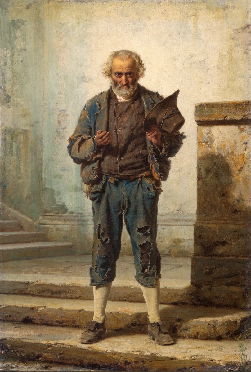 В картине «Старик-нищий» его внимание обращено к простому человеку — бедному старику, просящему подаяние. В прямом взгляде героя читается достоинство и сила духа, несмотря на ветхую одежду и тяжёлую долю. Светлая стена и тёплый колорит подчёркивают живописность образа и человечность художника, сумевшего увидеть красоту даже в нищете.