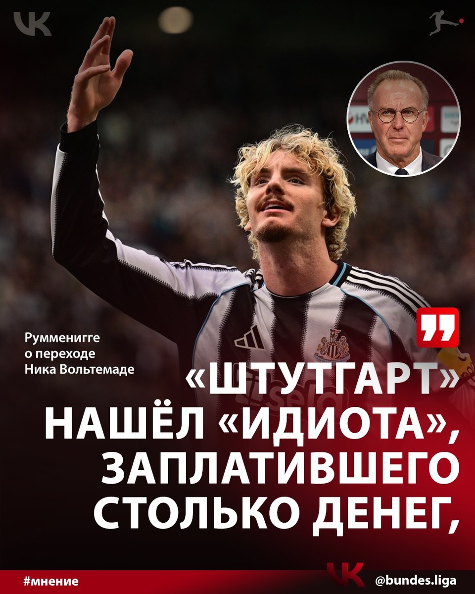⚡️ Член наблюдательного совета «Баварии» Карл-Хайнц Румменигге высказался о переходе Вольтемаде из «Штутгарта» в «Ньюкасл Юнайтед» за € 85 млн. 💬 «Буду честен: когда возникла вся эта история с Вольтемаде и требованиями «Штутгарта», я, равно как и Ули Хёнес, Герберт Хайнер, Ян-Кристиан Дрезен и Макс Эберль, пришли к выводу: ребята, мы дошли до неприемлемых сумм. Мы не должны идти на подобное, просто чтобы кто-то остался доволен, особенно финансисты «Штутгарта». 👉 Могу только поздравить «Штутгарт» с тем, что они, — позвольте мне здесь использовать кавычки, нашли «идиота», заплатившего столько денег, ведь мы бы так не поступили», — приводит слова Румменигге Yahoo Sports со ссылкой на Bayernisch Rundfunk. 🏆 Это Бундеслига, брат! #Бундеслига