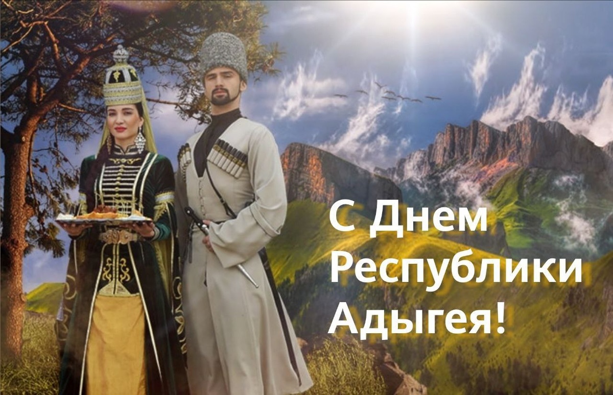 Дорогие земляки! Примите искренние и сердечные поздравления с Днем Республики Адыгея! Сегодня мы отмечаем знаменательное событие – День Республики. Эта дата, определившая государственно-правовое устройство и общественно-политический облик Адыгеи, олицетворяет весь ее исторический путь, служит символом единства и сплоченности, дружбы и взаимопонимания. Столетие республики – не только веха пройденного пути, но и старт нового этапа развития с высоким качеством жизни населения. Благословенная адыгская земля по праву считается прекраснейшим местом для жизни. Расположенная в прекраснейшем месте нашей страны многонациональная Адыгея объединила представителей разных народов и культур, стала примером межэтнического согласия и дружбы. Пусть и дальше процветает наша Республика, а жизнь каждого человека будет наполнена радостью, благополучием и уверенностью в завтрашнем дне. Крепкого вам здоровья, счастья и благополучия!