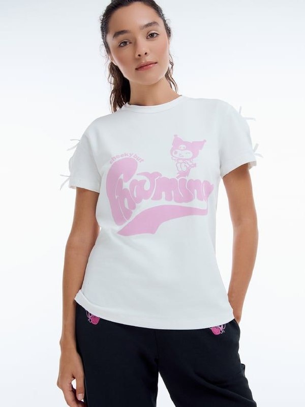 ТВОЕ продолжает как из пулемёта выдавать новые коллекции. В сети магазинов появилась одежда в честь Kuromi. В Куромикор-дропе база из штанов, футболок и курток (с бантиками!), из которой выбивается разве что боди — таким масс-маркет радует нечасто.