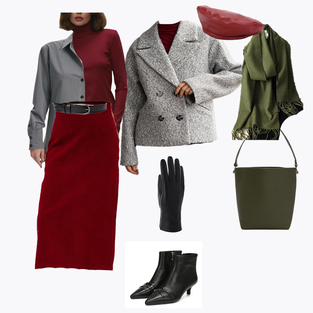 Один из классных стилистических приемов- многослойность, и она как нельзя кстати в холодное время года. Здесь у нас первым слоем водолазка, поверх которой рубашка из костюмной ткани - идеальное сочетание. Юбку я выбрала с высоким содержанием шерсти, чтобы было комфортно. Полупальто не утепленное, но за счет фактуры оно теплее, чем обычные - можно носить и в конце осени. Колготки берем черные от 70 den - если они в цвет обуви, то ботильоны с юбкой смотрятся хорошо, нет горизонтальной линии, режущей ногу. Ну, и не могу не отметить сочетание цветов: теплым зеленый с бордовым (он тоже тут с теплинкой) и нейтральный серый - идеально.