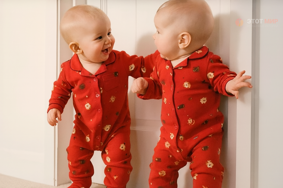 В самом конце коридора, в тени, стояли они – плечом к плечу, в одинаковых красных пижамах. Босые, с растрёпанными волосами, сжимающие руками дверной косяк. Дверь за их спинами была закрыта.