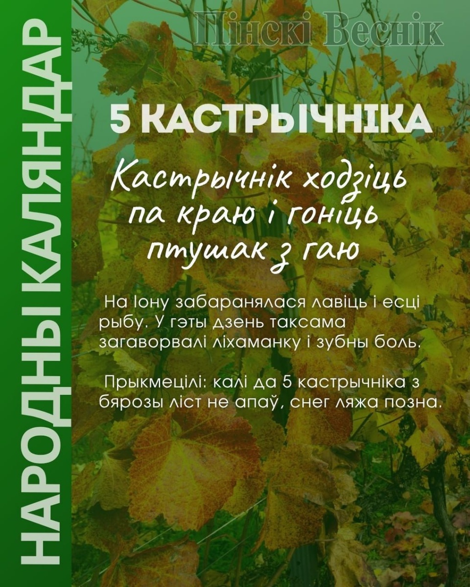 📎📎📎📎📎🔺📎📎📎 📎📎📎📎📎📎🔺📎📎📎 ✅5 кастрычніка 🔹На Іону забаранялася лавіць і есці рыбу. У гэты дзень таксама загаворвалі ліхаманку і зубны боль. Прыкмецілі: калі да 5 кастрычніка з бярозы ліст не апаў, снег ляжа позна. 📍📍@Пинский Вестник ЮТУБ | САЙТ| ИНСТ | ВК | ОК | ФЕ | Прислать новость