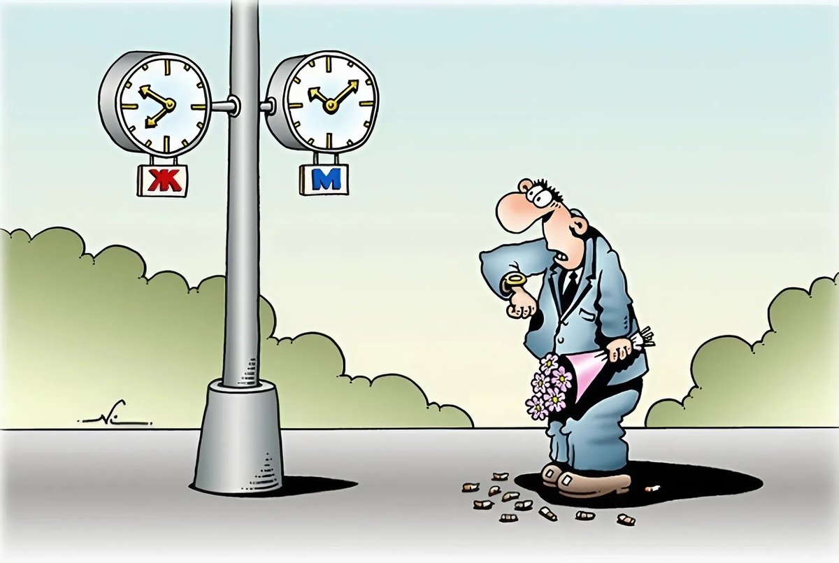 Мы переоцениваем, сколько успеем, и в итоге снова спешим. Эта тревога превращается в комедию, когда человек с серьёзным видом обещает «через пять минут буду», хотя только чистит зубы. В карикатурах именно это доводится до абсурда — и становится зеркалом нашего ежедневного хаоса.