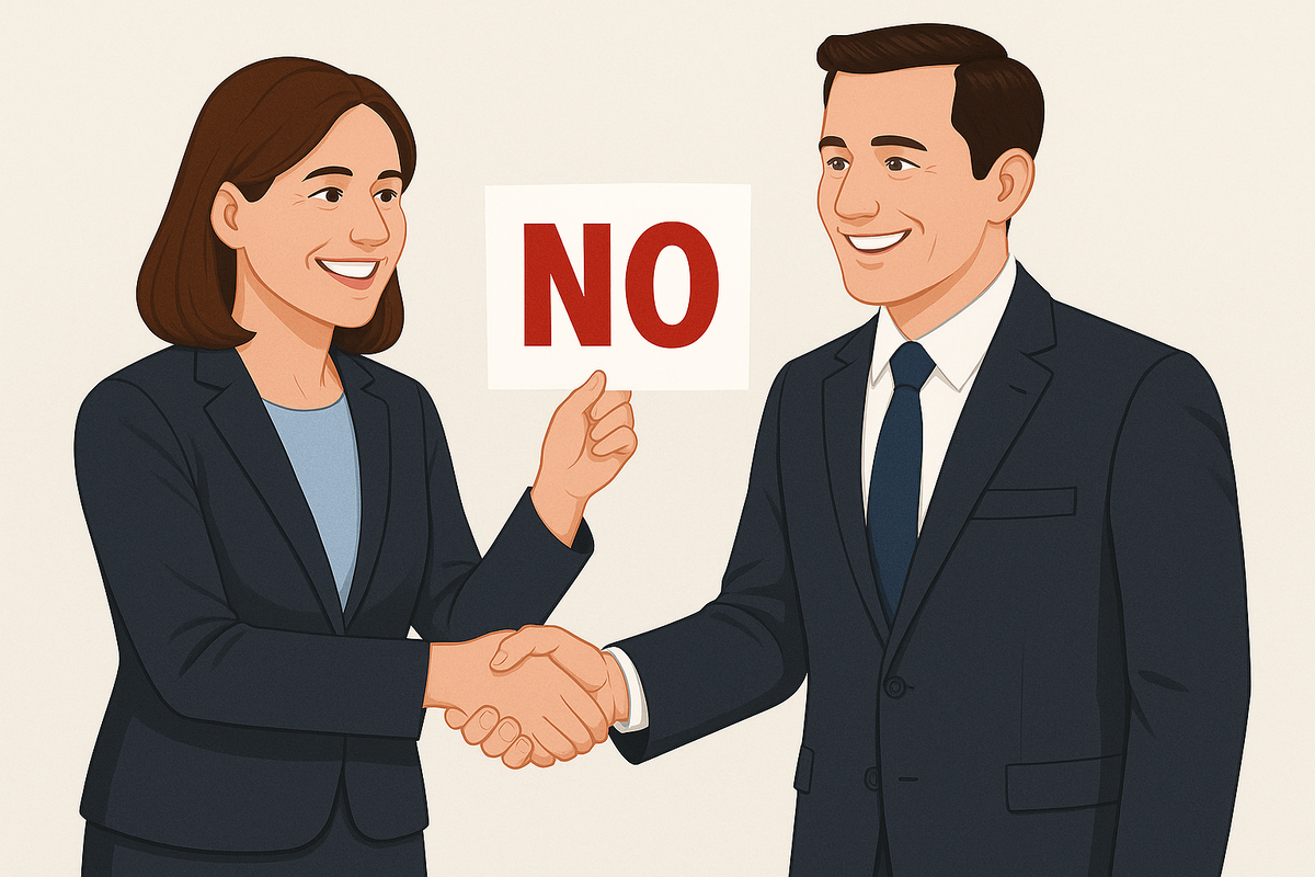 Мы часто соглашаемся не потому, что хотим, а потому что неудобно отказать. Нам кажется: если скажем «нет», испортим отношения, покажемся грубыми, потеряем шанс. Но на деле происходит обратное: когда ты умеешь говорить «нет», твоя ценность растёт. Почему «нет» — это не конфликт, а граница Большинство людей воспринимают отказ как удар. Но в переговорах, в бизнесе и просто в жизни «нет» — это не конец диалога, а сигнал: здесь есть границы. Когда человек умеет обозначать свои границы спокойно и без агрессии, он вызывает уважение. Его слова начинают весить больше. Если ты соглашаешься на всё, ты растворяешься. Если умеешь отказывать - становишься понятным. И в переговорах, и в работе с клиентами это ключевое отличие: с тобой проще иметь дело, потому что ты предсказуем и честен. Почему умение отказывать — это мягкий навык Навык отказа — часть эмоционального интеллекта. Чтобы сказать «нет» спокойно, нужно чувствовать момент, понимать состояние другого и уметь донести позицию без нападения