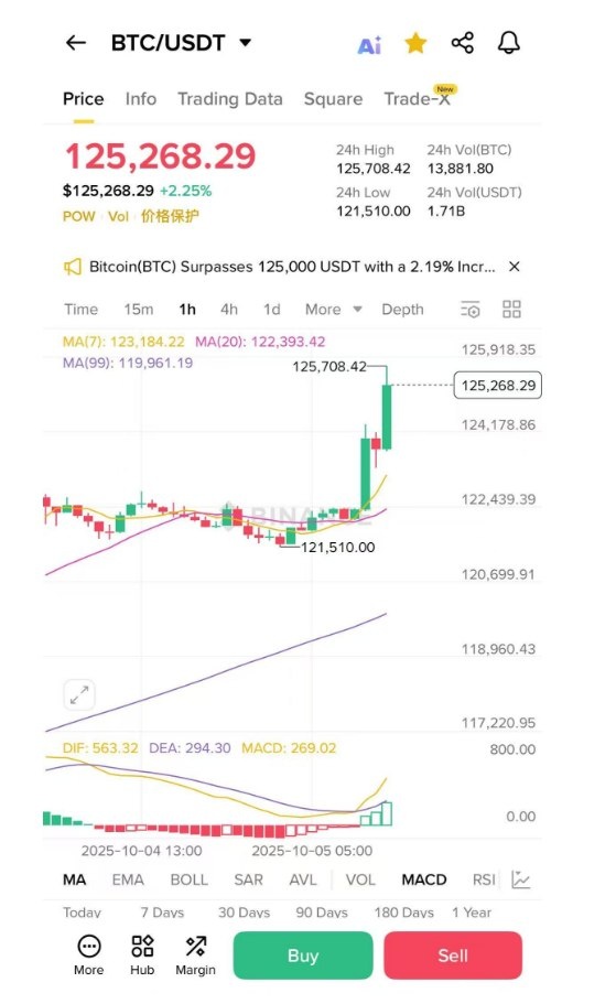 🔸Данные рынка Binance показывают, что BTC пробил уровень в $125 000 и сейчас торгуется на отметке $125 268, прибавив 2.25% за 24 часа и установив новый исторический максимум.