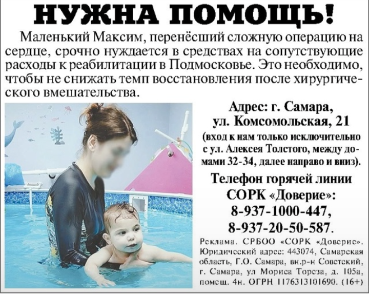 Маленький Максим, перенёсший сложную операцию на сердце, срочно нуждается в средствах на сопутствующие расходы к реабилитации в Подмосковье. Это необходимо, чтобы не снижать темп восстановления после хирургического вмешательства. Проживает он с мамой и братиками в Самарском епархиальном центре "Дом для мамы". Необходима сумма не менее 70 000 рублей. Адрес: г. Самара, ул. Комсомольская, 21 (вход только исключительно с ул. Алексея Толстого, между домами 32-34, далее направо и вниз). Саму реабилитацию ему оплатит благотворительный фонд. Телефоны для справок и возможности оказать помощь 89371000447; 89372050587. Фотография дана из нашего архива, с разрешения мамы. Мессенджеры через которые можно оказать помощь: https://sberbank.com/sms/ppinv?reqId=1687454089685 https://qr.nspk.ru/AS1A006GOO9J2E7G8HR8BSMTGJFF0CN4?t.. https://vk.com/app6471849_-64174424?ref=group_menu