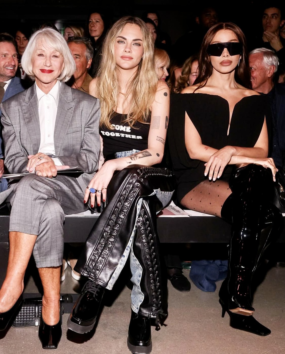 Футболка на Каре Делевинь со строчкой из хита битлов "Come together ", как символ новой коллекции Стеллы Маккартни. Саму коллекцию на будущую весну еще успеем обсудить. А вот гости хороши! Показ Стеллы Маккартни на Неделе моды в Париже собрал яркую плеяду знаменитостей, включая Джонни Деппа, Хелен Миррен, Кару Делевинь, Аниту, Вуди Харрельсона, Пэрис Джексон и дуэт матери и дочери Робин Райт и Дилан Пенн.