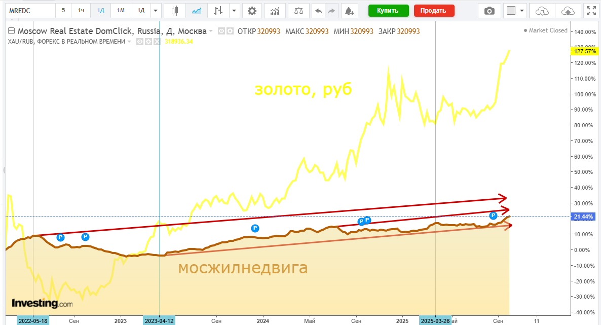 Инфляция в РФ, официальная, по периодам С сентября 2020 по н.вр.: 51% С мая 2022 по н.вр.: 22,6% С апреля 2023 по н.вр.: 20,3% С июля 2024 по н.вр.: 9,6% На графике цены квадратного метра московской жилой недвиги - инфляция за эти периоды в виде красных векторов: На картинке видно, что жилая недвижимость, всё таки, остаётся противоинфляционным активом: купленное в общем и целом подрастает примерно на величину официальной инфляции. Разумеется, купленное по низу инфляционного канала, т.е. в январе 2023, в январе и июне 2025 - почти постоянно в плюсе (с учётом инфляции). Вывод №1: Если хочешь купить квартирку в Москве - покупай её в январе. В январе, кстати, закрываются новогодние депозиты в банках, а они обычно имеют повышенную доходность. Как раз снимутся сливки с депозитов - и алга в недвигу. На этом же графике видно, что самые высокие цены (с учётом инфляции) наблюдались в мае и июне - что противоречит общепринятому мнению о пике в декабре. Абсолютные цены, без учёта инфляции, конечн