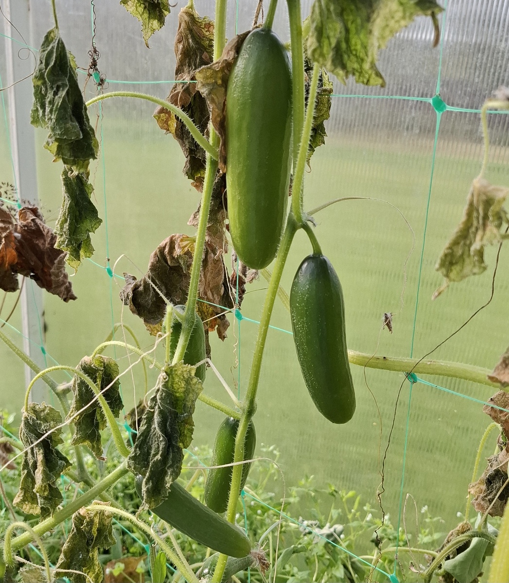 Вот и пришла поздняя осень - утром всё покрыто инеем, днём пока солнечно воздух немного прогревается. Огуречные растения в теплице конечно обмёрзли, но некоторые огурчики вроде неплохо выглядят, собрала, посмотрю. Последние томаты висели на кустах вполне целые, вот этот сорт прям хорошо выглядит (плоды, а не сами кусты, конечно) Вот он, финальный сбор, последняя корзинка от 5 октября 2025 года. Черрики в основном скинули все плодики, а их было очень много до потолка, а вот крупноплодные нормально довисели, надеюсь, не все промёрзли. Вообще, ближе к северно двери в теплице выросла настурция - она там бодра и зелена, а вот у южной двери вся помёрзла. Может, и томаты как-то выборочно мёрзли? В открытом грунте сняла последние кочаны капусты, выдернула оставшуюся редиску - слизни её слищком активно кушают, на пробу вытянула пару дайкона - ещё мелкий, со среднюю морковку. А напоследок - соседские куры в качестве насеста облюбовали ветку дерева, свисающую на наш участок, так что периодически