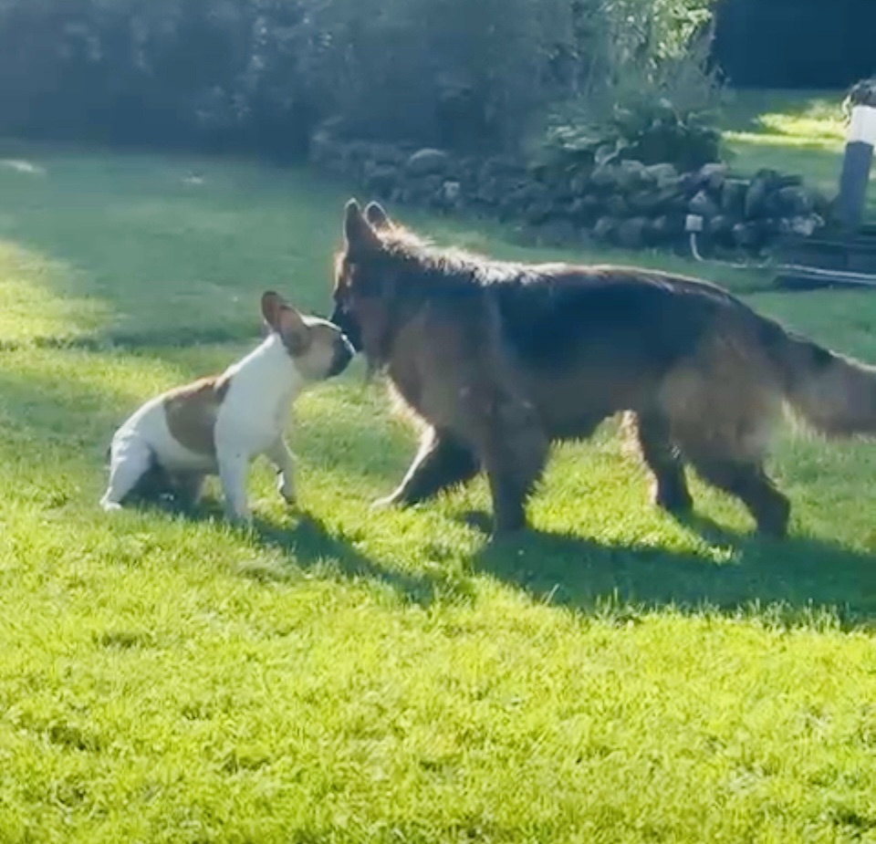 С ней пришла знакомится соседская овчарка, они даже успели подружиться (играли на нашем участке) ну и мелкая всячески показывала, кто хозяин участка.. а кто тут по соседски заскочил)